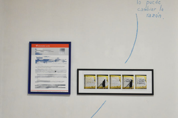 Composición de intervenciones: Intervención digital en documento oficial, intervención en espacio público, intervención de tiza sobre muro.